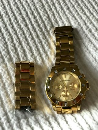 reloj dorado con incrustaciones de circonita, con correa ajustable, un par de usos. muy bueno, muy buen estado!