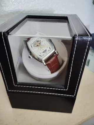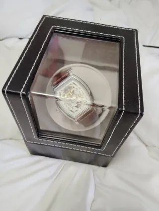 Preciosa caja expositor que gira para que nunca se pare tu reloj, funciona 5m y se para 10 para mantenerlo siempre en marcha, funciona con USB incluído y lleva motor silencioso para no molestar de noche, muy bonita, se encuentra en perfecto estado sin un solo roce