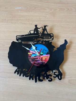 Original reloj de pared hecho a mano con un disco de vinilo. Presenta un diseño recortado con la silueta de Estados Unidos y una escena retro. - Funciona con una pila, la pila actual está gastada, no puedo comprobar si el reloj funciona!!