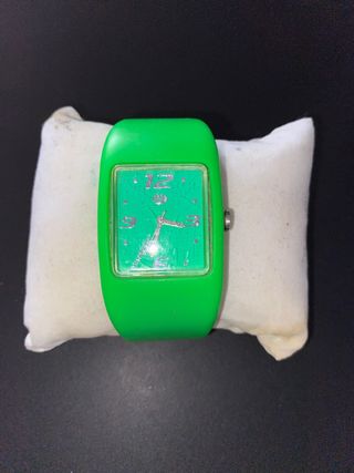 Reloj marca Marea en su caja original (la caja tiene un par de manchas dentro). Color verde fosforito. La pulsera y la esfera se pueden separar. La pulsera es tipo silicona. Es sumergible. No lleva pila. El cristal de la esfera tiene algún rayajo por el uso.