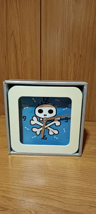 Reloj de esqueleto, funciona con pilas, se tiene en pie y se puede colgar