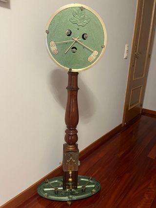 Elegante reloj artesanal de pie con un diseño único. - Base ovalada decorativa con ruedas - Mecanismo visible en la base. - Esfera redonda con detalles metálicos. Maquinaria en funcionamiento.