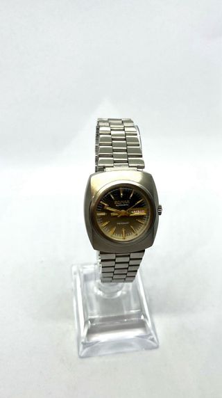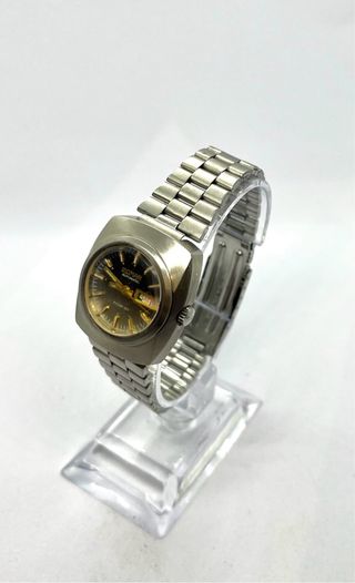Reloj Pomar automático de fabricación suiza años 70, con sistema antichoque tipo Incabloc y calendario día‑fecha a las tres en punto. Presenta caja tipo cojín en acero o metal cromado cepillado, con cristal abombado y corona estriada, todo en buen estado estético para su edad. La esfera muestra un bonito degradado dorado‑ahumado estilo “sunburst”, índices aplicados y agujas tipo bastón, ofreciendo una lectura muy clara y un look vintage elegante. Monta brazalete metálico tipo armis de eslabón ancho, cómodo y muy acorde al diseño original de la época. Es un reloj automático en correcto funcionamiento, ideal para quien busca una pie