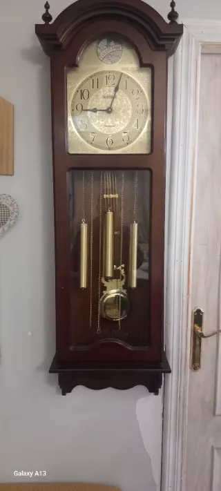 Vendo elegante reloj de pie de la marca Junghans en perfecto estado. Marca los cuartos, medias horas y horas o también se puede silenciar. Madera maciza. Medidas: 206 cm. alto x 54 cm. ancho x 27 cm. de fondo. - Diseño clásico y sofisticado. - Mecanismo visible a través de la puerta de cristal. - Péndulo y pesas de latón. - Incrustaciones decorativas en la base y el cuerpo.
