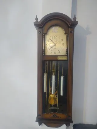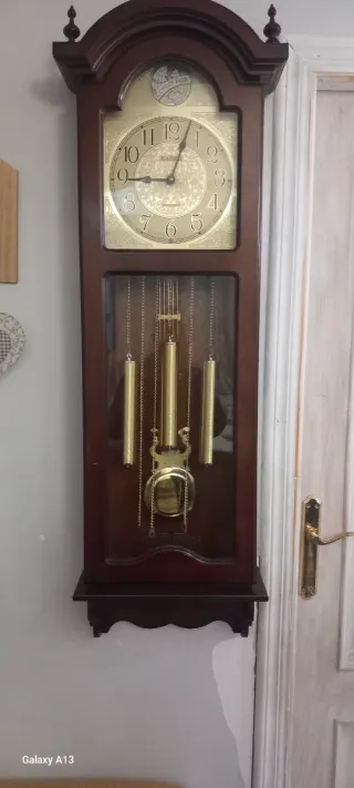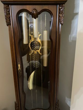 Elegante reloj de pie con un diseño clásico y acabados en madera. - Detalles en dorado. - Mecanismo visible a través del cristal. - Péndulo y pesas decorativas. - Negociable