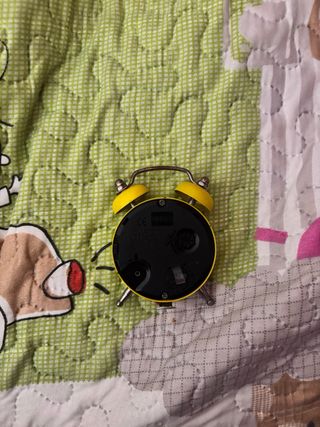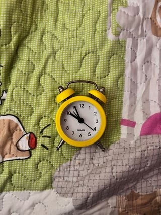 Pequeño reloj despertador con un diseño clásico y llamativo. - Esfera redonda con números claros. - Dos campanas en la parte superior. - Patas para mantenerlo de pie.