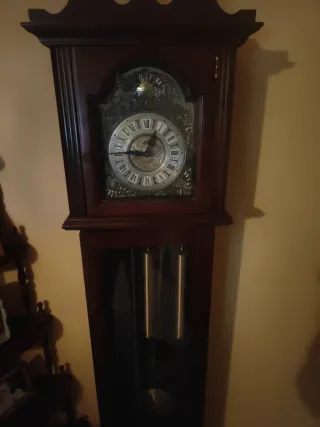 Elegante reloj de pie Carrion con un diseño clásico. - Acabado en madera oscura. - Esfera con números romanos. - Incluye péndulo y dos pesas doradas. Ubicación Sevilla capital. Precio negociable