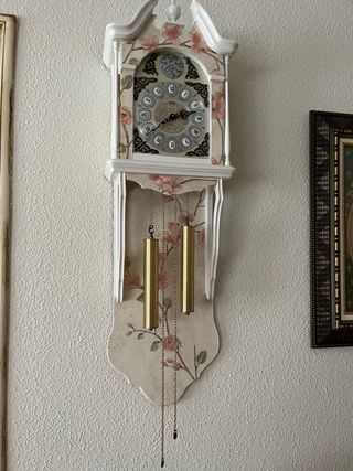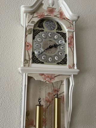 Elegante reloj de pie Oared con un diseño floral. - Esfera con números romanos y detalles ornamentales. - Péndulo y pesas dorados. - Acabado blanco con motivos florales en la parte superior y central.