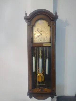 Elegante reloj de pie de la marca Reloj Carriñon. Su diseño clásico aporta un toque de distinción a cualquier espacio. - Acabado en madera oscura. - Detalles dorados en la esfera y péndulo. - Tres pesas doradas.