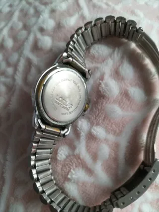 Reloj de pulsera de la marca Orient con un diseño clásico y elegante. - Esfera en tono dorado. - Correa extensible en plateado. - Ventana de día y fecha.