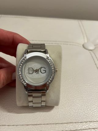 Elegante reloj de pulsera con un diseño llamativo. - Esfera rectangular con detalles brillantes. - Pulsera metálica con eslabones. - Adornos en forma de G en la pulsera.
