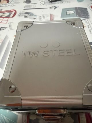 Caja para reloj de la marca TW Steel. Su diseño es elegante y protege tu reloj. - Acabado metálico plateado. - Esquinas reforzadas con detalles metálicos.