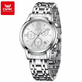 Elegante reloj OPK con un diseño sofisticado. - Esfera blanca con detalles plateados. - Correa de metal plateado. - Indicadores de hora y minutos. - Función de cronógrafo.