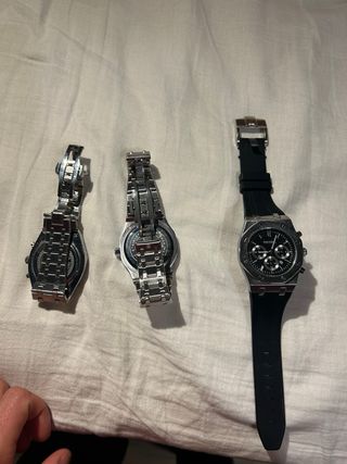 Conjunto de tres relojes para hombre. - Dos relojes con correa y caja de metal plateado. - Un reloj con correa de caucho negra y caja de metal plateado.