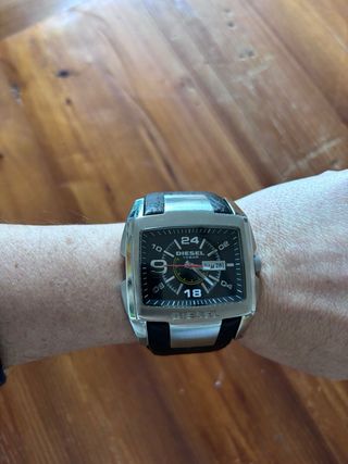 Reloj de pulsera con correa de piel negra y detalles plateados. Reloj vintage muy raro, uno de los primeros modelos sacados por Diesel. Resistente al agua 100m. - Esfera oscura. - Cierre de hebilla. Muestras de desgaste en las fotos.