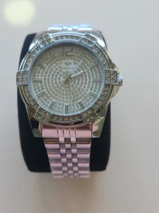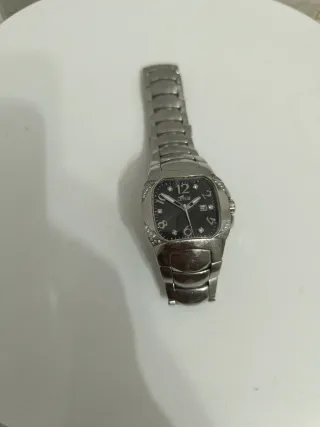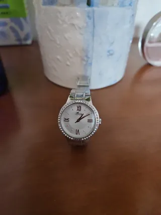 Elegante reloj de pulsera con un diseño sofisticado. - Esfera plateada. - Bisel adornado con cristales. - Brazalete de eslabones metálicos. Es original. Lo vendo porque nunca me lo pongo.