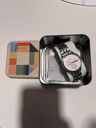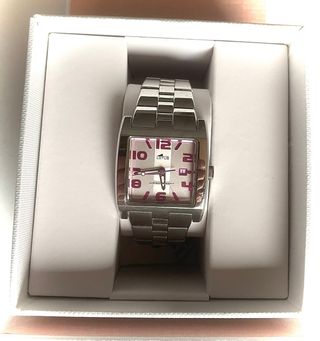 Elegante reloj de pulsera para mujer con un diseño sofisticado. - Caja rectangular con detalles brillantes. - Correa de eslabones metálicos. Reloj de pulsera sencillo pero elegante de Fossil. Con incrustaciones a los lados de la esfera rectangular. Pilas recién cambiadas. El precio se negocia en la app, no presencialmente. Puedes venir a valorarlo si quieres en persona y decidir si lo compras o no.