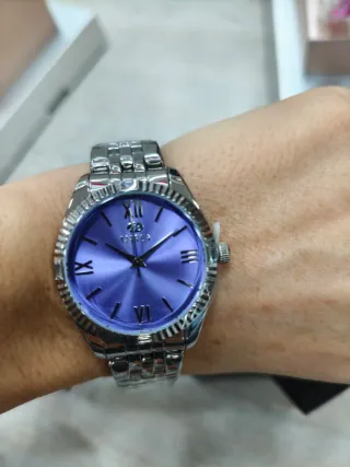 Elegante reloj de pulsera con esfera azul y detalles plateados. Sumergible 3 años de garantía+ caja. - Diseño moderno y versátil. - Correa de eslabones plateada. - Bisel con relieve.