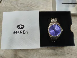 Elegante reloj de pulsera Marea para mujer con un diseño moderno y sofisticado. -Esfera 3,8 cm, sumergible,3 años de garantía. - Esfera plateada con detalles en azul. - Bisel con acabado acanalado.