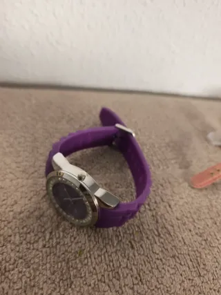 Elegante reloj de pulsera para mujer de la marca Eve Mon. - Esfera de color morado. - Bisel adornado con pedrería. - Correa de silicona morada.