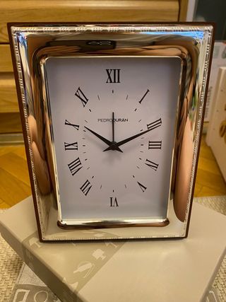 Reloj de Pedro Durán con marco bañado en plata de 1ª ley La elegancia en su diseño y su prestigiosa marca lo convierten en un regalo muy especial y en un artículo de decoración vintage para cualquier ambiente El reloj está lacado para preservar el brillo de la plata con un tratamiento especial de Pedro Durán para que la plata brille a lo largo del tiempo sin necesidad de una limpieza especial Tiene muchos años con algún defecto de cclor casi imperceptible en la esquina inferior izquierda y en la superior derrecha pero es nuestro deber advertirlo Funciona perfectamente Alarma integrada Ancho 12,5 Alto 15,5 Fondo 2 cm