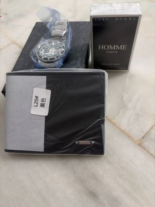 Conjunto de tres piezas para hombre. - Cartera de color negro. - Reloj con correa plateada. - Colonia Pure Homme de 100ml.