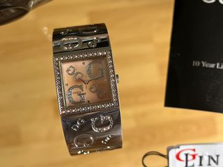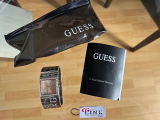 Elegante reloj Guess para mujer con un diseño moderno y llamativo. Poco uso, esta en perfecto estado. Pilas agotadas, pero funciona perfectamente. Comprado en Nueva York, costó 90$ como se puede ver en la etiqueta. - Esfera en tono rosa. - Brazalete metálico plateado con detalles de la marca, ajustable, pudiendo quitar eslabones. - Incluye manual de instrucciones y bolsa de la marca.