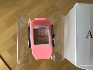 Reloj de pulsera de la marca Aresso con un diseño moderno y llamativo. Casi sin uso. Pilas gastadas, pero funciona perfectamente. - Correa de silicona en color rosa. - detalles en plateado. - Esfera cuadrada. - en su caja original.