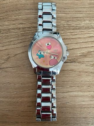 Reloj de Tous con un diseño llamativo y juvenil. La esfera tiene un fondo rosa con personajes animados y detalles. - Correa y caja de metal plateado. - Esfera redonda con números y figuras. - Cierre de seguridad. - la pila esta gastada