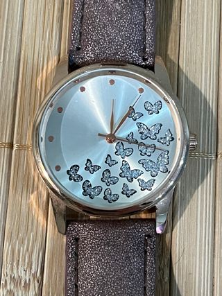Elegante reloj con un diseño encantador de mariposas brillantes en la esfera. - Esfera plateada con detalles de mariposas. - Correa con acabado texturizado. - Bisel en tono rosa.