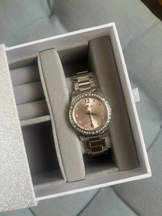 Elegante reloj Lotus Bliss con esfera rosa. - Diseño con detalles brillantes en el bisel. - Correa plateada de eslabones. Está sin estrenar fue un regalo que no quise aceptar y la perdona no quiso recibírmelo. Viene con caja joyero, garantía, bolsa de regalo. Como puedes ver tiene el plástico protector.