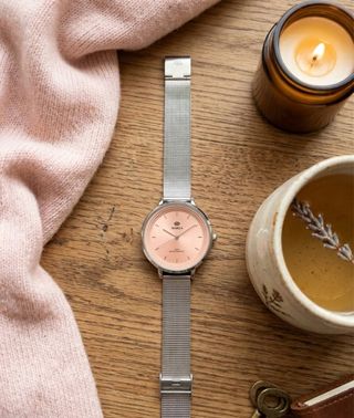 Elegante reloj de pulsera con un diseño moderno. - Correa de metal plateado. - Esfera con tonos rosados.