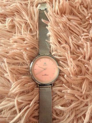 Elegante reloj Marea con una llamativa esfera rosa y una pulsera metálica. - Diseño moderno y atractivo. - Resistente al agua 5 ATM. (Falta ponerle pila)