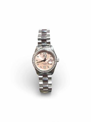 Elegante reloj de pulsera con esfera rosa y detalles plateados. - Diseño moderno y sofisticado. - Correa de eslabones metálicos.