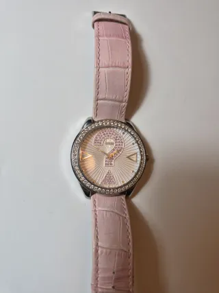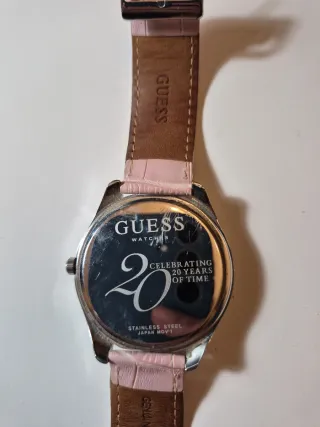 Reloj de Guess con un diseño especial de aniversario - Correa de piel en color rosa, un poco gastada. - Bisel adornado con pedrería. - Esfera con detalles en pedrería rosa y marcadores plateados.