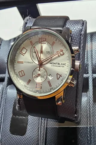 Elegante reloj Montblanc con función Flyback y certificado Chronometer. Su diseño combina tonos dorados y plateados, aportando un toque de distinción. - Esfera plateada con detalles en oro rosa. - Correa de piel negra. - Indicador de fecha. - Movimiento suizo.