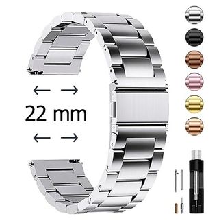 Preciosa correa de reloj de metal, de 22mm de ancho con cierre de liberación rápida. Es de color plata y tiene un diseño elegante y sofisticado. - Material: Metal. - Ancho: 22 mm. - Cierre: Liberación rápida. - Incluye herramienta para ajustar.