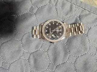 Elegante reloj Rolex Datejust con detalles de circonitas y esfera negra. Falta ponerlo en hora - Bisel adornado con circonitas. - Esfera negra con marcadores de hora. - Pulsera de eslabones plateada.