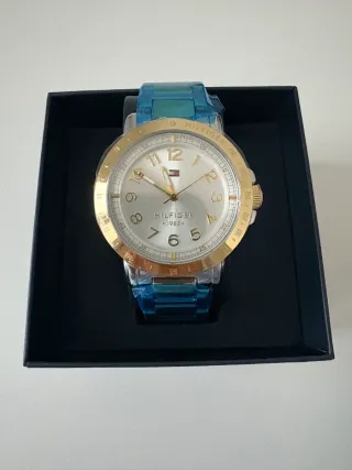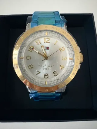 Elegante reloj Tommy Hilfiger con un diseño bicolor que combina tonos dorados y plateados. Un accesorio llamativo y versátil. En acero inoxidable la esfera es de color plateada con diales dorados. Caja de 38 mm - Bisel con detalles en dorado. - Correa con eslabones en dorado y plateado. Completamente nuevo. Perfecto como regalo para estas fiestas . Se envia con su caja original.