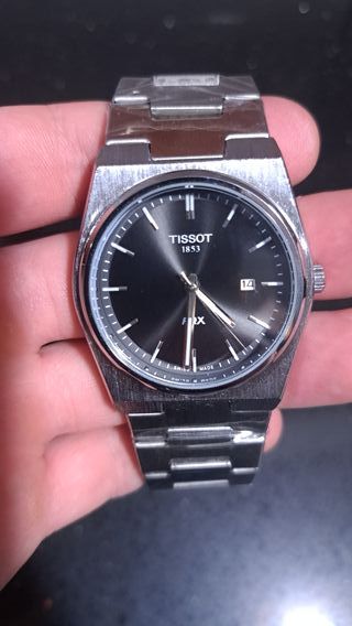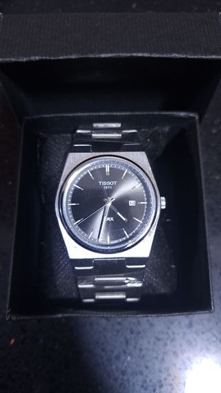Reloj Tissot PRX con esfera negra y detalles plateados. Se entrega con la caja - Movimiento de cuarzo. - Diseño deportivo y elegante. - Brazalete de acero inoxidable.