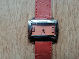 Elegante reloj Louis Valentin con diseño rectangular. - Correa de piel naranja. - Detalles plateados en la caja. - Nuevo nunca se ha usado.