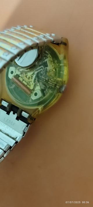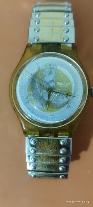 Reloj Swatch de pulsera, en tonos amarillos y plata. Se encuentra en buen estado.30 euros la unidad - Correa de metal. - Esfera con diseño distintivo.