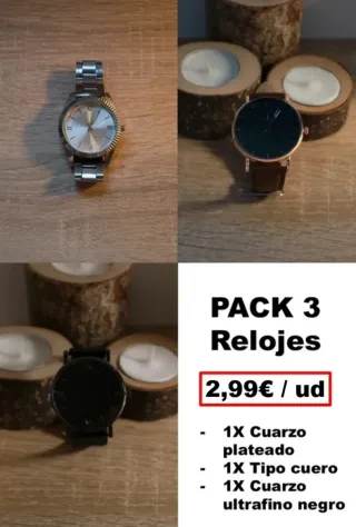 Pack de 3 Relojes de cuero y cuarzo – 35mm 📝Listado y características del producto: - 1X reloj de cuarzo ultrafino en color negro - 1X reloj de cuarzo plateado - 1X reloj de tipo cuero marrón 📏 El diámetro de los tres relojes oscila en en los 35mm más o menos. El reloj de cuarzo ultrafino y el de tipo cuero, son ajustables. El de cuarzo plateado, es para muñecas de unos 17/18 cm. 🆕 Todos están en gran estado, muy poco usados. Únicamente, el de color negro, tienen algunos pequeños desperfectos en la correa, prácticamente irrisorios, pero esta parte no es apenas perceptible a la vista. 📸 Escríbeme si deseas saber más info.
