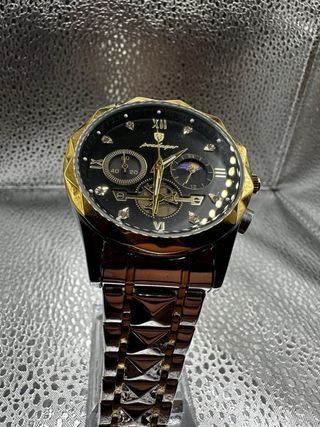 Reloj con esfera negra elegante y detalles dorados que le dan un toque moderno y sofisticado. Su correa metálica aporta resistencia y estilo, perfecto para el día a día o para lucir en ocasiones especiales. Precio negociable 😉⌚ - Diseño moderno y sofisticado. - Correa de eslabones metálicos.