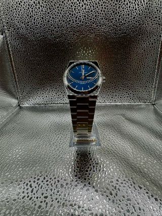 Elegante reloj de pulsera para hombre con esfera azul y detalles plateados. - Diseño moderno y llamativo. - Correa con acabado plateado.