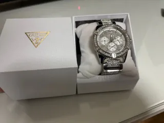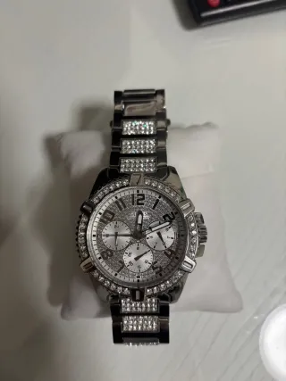 Elegante reloj Guess con un diseño llamativo y detalles brillantes. - Bisel adornado con cristales. - Correa de eslabones plateada con incrustaciones de cristales. - Esfera con múltiples subesferas.