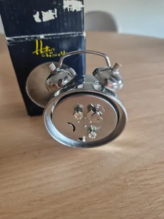 Reloj despertador de mesa con un diseño divertido y llamativo. - Esfera con simpáticas mariquitas. - Acabado plateado brillante. - Incluye caja original.