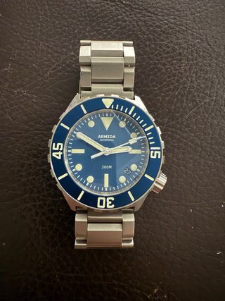 Reloj de buceo Armida A1 de 42mm con esfera azul y detalles plateados. - Bisel giratorio unidireccional. - Correa de metal. - Resistencia al agua de 300 metros. - incluye correa de caucho negra y links extra para el brazalete. -pregunta sin compromiso.