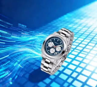 Elegante reloj de pulsera para hombre con un diseño moderno y deportivo. La combinación de colores azul y plateado le da un toque sofisticado. - Esfera con detalles en azul. - Correa de metal plateado. - Bisel con marcadores de tiempo.
