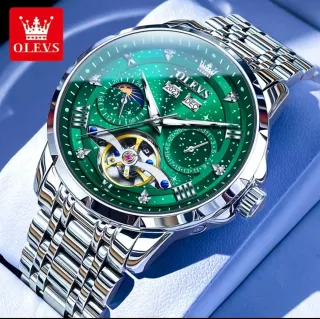 Elegante reloj OLEVS para hombre con un diseño llamativo. - Bisel con detalles en verde y dorado. - Correa combinada en acero plateado y dorado. - Esfera verde con subesferas y detalles dorados.